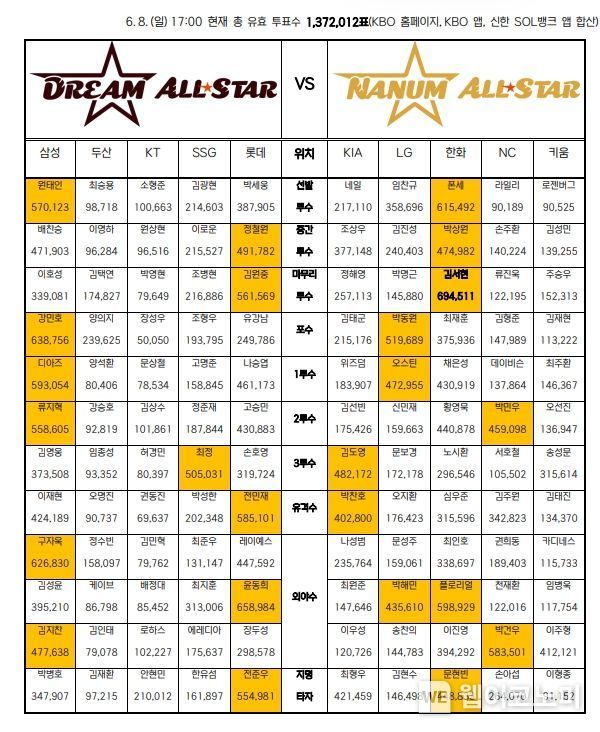 전반기가 진행 중인 가운데 550만 관중을 돌파한 2025 시즌 KBO 리그의 열기는 올스타 팬 투표에도 반영됐다. 1차 중간 집계 결과 총 투표수 137만 2,012표로, 2024 올스타전 1차 중간 집계 때의 128만 2,813표 보다 약 7% 증가했다.