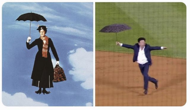 | 지난해 7월 19일 프로야구 LG트윈스와 두산베어스 경기가 열리던 잠실 구장에서 우산을 펴고 난입한 A씨의 모습과 영화 ‘메리포핀스’의 한 장면이 유사하다며 만들어진 ‘잠실 포핀스’ 밈. (사진=SNS 갈무리) |