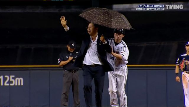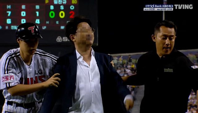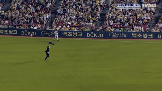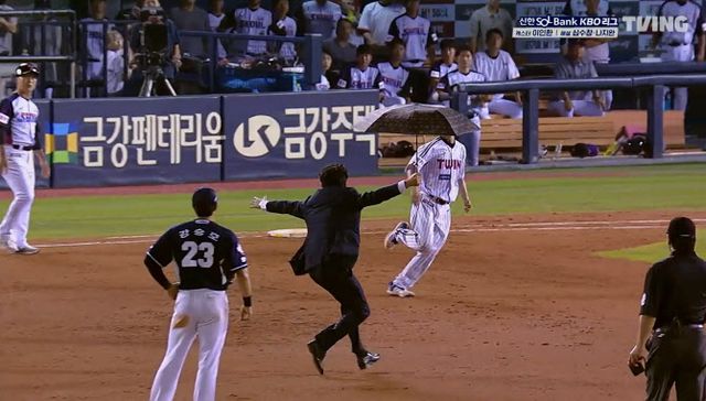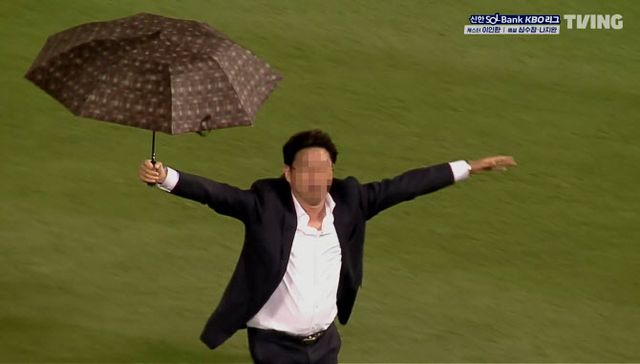 | 지난해 7월 19일 프로야구 LG트윈스와 두산베어스 경기가 열리던 잠실 구장에서 우산을 펴고 난입한 A씨가 구단 관계자들에 의해 그라운드 밖으로 이동하고 있다. (사진=티빙 중계영상 갈무리) |