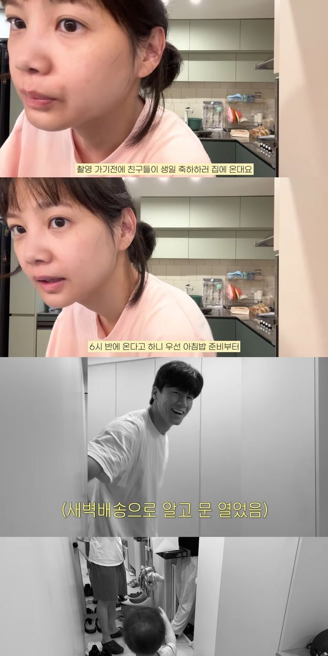 이날 윤승아는 김무열 생일 아침부터 카메라를 켜 "오늘 오빠 생일인데 6시도 안 됐다. 오빠가 하루종일 촬영이라 가기 전에 친구들이 서프라이즈 해준다고 해서 6시 반에 (집에) 온다고 한다"며 김무열과 친구들을 위한 아침을 준비했다.