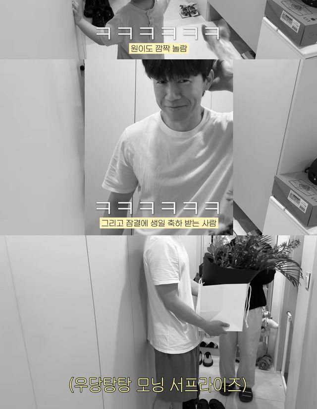 새벽 배송인 줄 알고 문을 연 김무열은 잠에서 덜 깬 채 축하를 받아 웃음을 자아낸다.