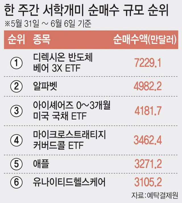 서학 개미들은 빅테크에서 자금을 빼 안전자산으로 자금을 이동시키고 있다. 이들은 한 주간 미국의 초단기 국채에 투자하는 ETF인 ‘SGOV’를 4181만 달러 규모를 사들였다. SGOV는 한 주간 서학 개미 순매수 3위에 이름을 올렸다. SGOV는 만기 3개월 이하의 미국 국채에 투자해 안정적인 이자 수익을 기대할 수 있는 상품이다. 보통 시장이 불안하면 단기채 ETF에 자금이 쏠리는 경향이 있다.