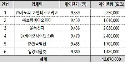 백신 조달은 조달청 공고(희망수량 경쟁입찰: 최저가격 입찰자 순으로 총 수요량에 도달할 때까지 입찰자를 낙찰자로 결정하여 구매하는 방식)를 통해 최저 가격(동일 가격 시 많은 물량)을 제시한 순으로 사노피-아벤티스코리아(주), ㈜보령바이오파마, (주)녹십자 등 6개 업체가 선정됐다.
