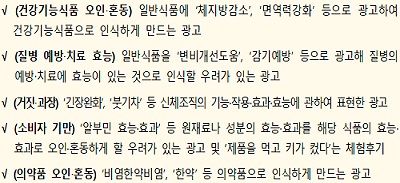 주요 위반 내용은 ▲일반식품을 건강기능식품으로 오인·혼동시키는 광고(97건, 41.1%) ▲질병 예방·치료에 대한 효능·효과가 있는 것으로 오인·혼동시키는 광고(74건, 31.4%) ▲신체조직의 기능·작용·효능 등에 대해 표현한 거짓·과장 광고(33건, 14.0%) ▲구매후기 또는 체험기 등을 이용해 소비자를 기만하는 광고(23건, 9.7%) ▲일반식품을 의약품으로 오인·혼동시키는 광고(8건, 3.4%) ▲자율심의결과를 따르지 않은 광고(1건, 0.4%)이다.