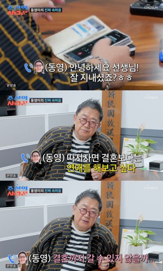 이용식은 "내가 방송 다 봤다. 내가 파악을 여러 가지로 분석을 해봤는데 너 결혼할 생각은 있니 없니"라며 질문했고, 김동영은 "따지자 이렇게 생각하면 결혼보다 연애를 해보고 싶다. 근데 진짜 좋은 사람이 있다면 결혼까지 당연히 갈 수 있는 부분이 있지 않을까"라며 고백했다.