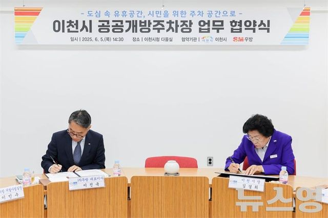 김경희 시장(오른쪽)과 이진욱 (주)우방 대표이사(왼쪽)가 '이천시 공공개방주차장 업무 협약식'에 서명을 하고 있다./사진=이천시