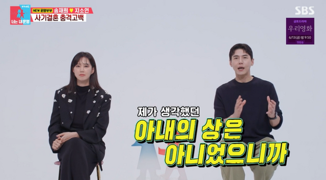 이에 대해 송재희는 “제가 생각하는 아내의 상은 아니었다. 저희 아버지는 가부장적인 분이었고, 아버지가 평생 무거운 짐을 드는 걸 본 적이 없다”며 “그런 분위기에서 살다 보니까 저도 모르게 내가 생각한 아내의 상이 생겼고 억압했던 것 같다”고 말했다.