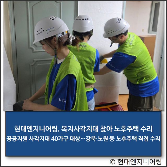 현대엔지니어링 관계자는 "복지 사각지대에 놓여 소외되었던 분들이 보다 쾌적하고 안전한 환경에서 생활할 수 있길 바라는 마음으로 이번 봉사활동을 시작했다"며 "일회성에 그치지 않고 지속적인 사회공헌 활동을 통해 지역사회에 기여할 계획"이라고 말했다.