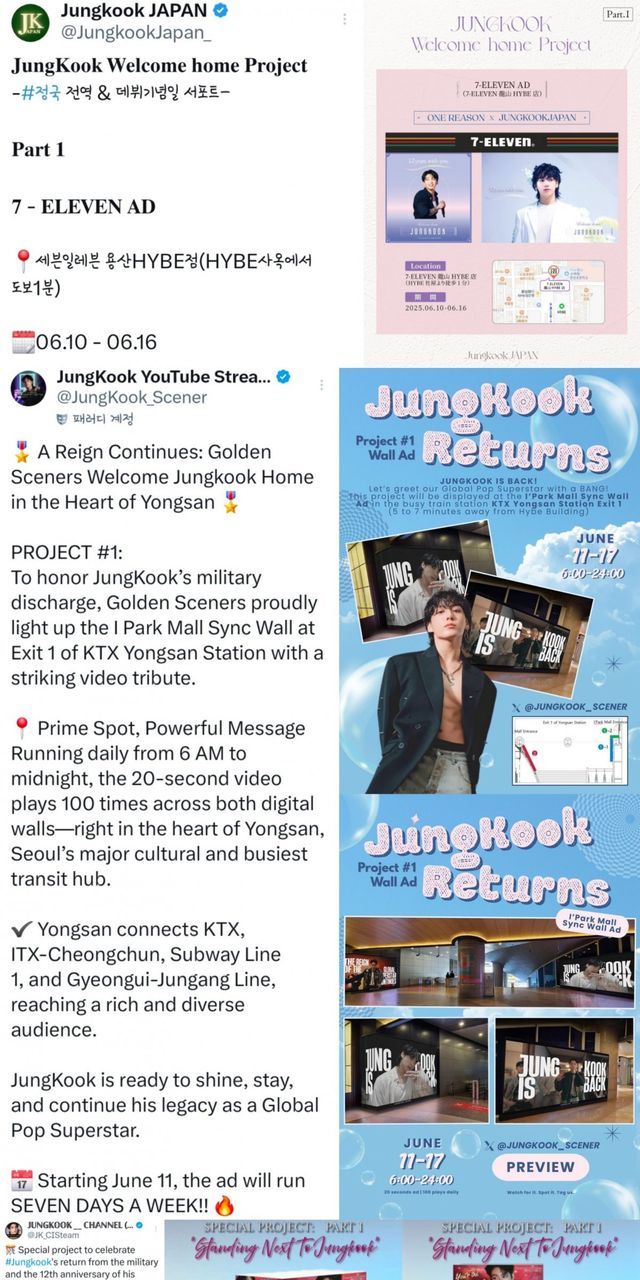 ‘정국 유튜브 스트리밍 팀’은 6월 11일부터 17일까지 용산 아이파크몰 싱크월 전광판에서 전역 축하 영상을 송출한다. ‘정국 채널 CIS’는 하이브 근처를 도는 영상 송출 트럭을 11일, 12일, 13일 3일간 운영한다.