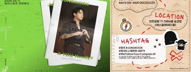 6월 5일부터 7월 4일까지는 서울 시내를 달리는 SSA급과 A급 버스 2개 노선에서도 정국 전역과 데뷔 12주년을 기념하는 광고가 이어진다. 인천공항에서도 정국을 만날 수 있다. 팬계정 ‘모꾸뽀꾸’는 6월 15일까지 인천공항 지하 4층 T1 승강장 전광판에서 ‘보고 싶었어, 정국아’라는 광고를 송출한다.