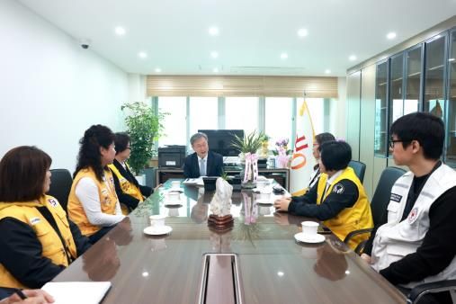 | ▲ 장인홍 구로구청장(가운데)이 지난 4월 대한적십자사 구로지구협의회와 차담회를 갖고 소통하고 있다 |