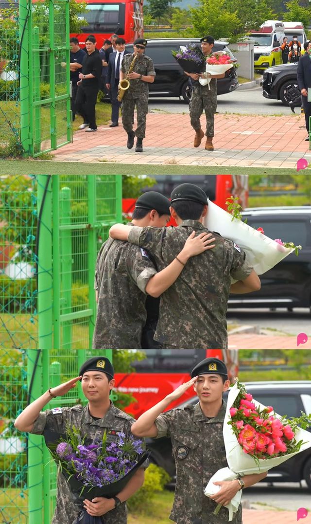 방탄소년단 RM가 뷔가 나란히 전역했다.