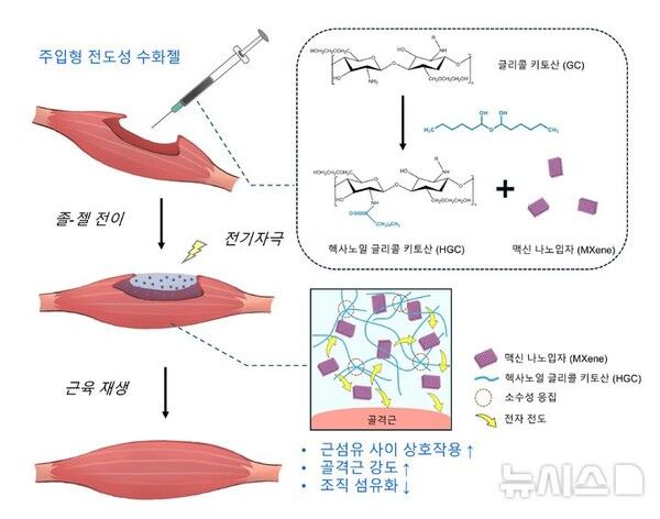 뉴시스 보도에 따르면, 광주과학기술원(GIST)은 신소재공학과 이재영 교수와 충남대학교 유기재료공학과 허강무 교수 공동연구팀이 근육 대량 손실을 효과적으로 치료할 수 있는 주입형 전도성 수화젤을 개발했다고 밝혔다.
