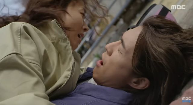 스쿠터 사고로 함께 넘어지며 처음 만난 백설희(장신영)와 문태경(서하준) / MBC