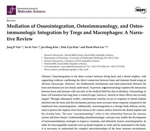 논문 제목은 '조절 T세포와 대식세포에 의한 골융합, 골면역학 및 골면역학적 융합의 중재(Mediation of Osseointegration, Osteoimmunology, and Osteoimmunologic Integration by Tregs and Macrophages: A Narrative Review)'로 임플란트 시술 후 일어나는 골융합(Osseointegration) 과정을 조절 T세포(Tregs)와 대식세포(Macrophage)의 골형성 조절 활성을 기초로 해 면역학적으로 해석했다.