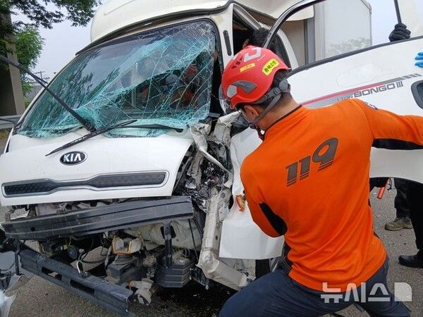 10일 오전 9시14분께 충북 청주시 청원구 오창읍의 한 도로에서 A(39)씨가 몰던 1t 화물차가 정차해 있던 안전 유도 차량(싸인카)을 들이받았다.