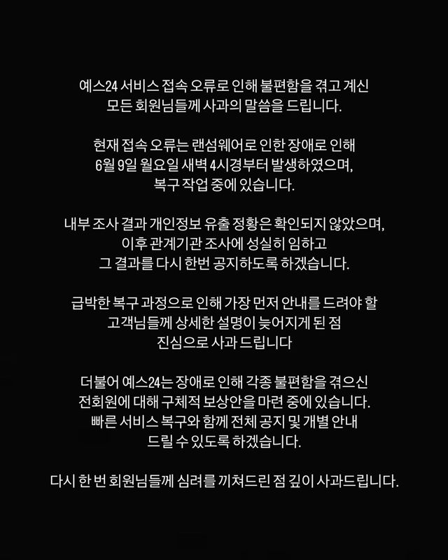 10일 예스24측은 공식 SNS 채널 등을 통해 서비스 오류와 관련한 공지 글을 게재했다. 예스24에 따르면 "현재 접속 오류는 랜섬웨어로 인한 장애로 인해 6월 9일 월요일 새벽 4시경부터 발생하였으며, 복구 작업 중"에 있는 상태로 "내부 조사 결과 개인정보 유출 정황은 확인되지 않았다"라고 밝혔다.