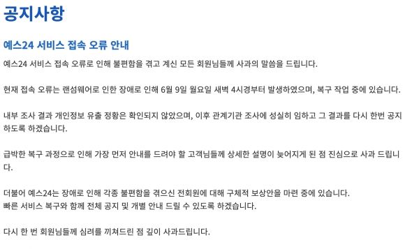 예스24는 지난 9일 새벽 4시경 발생한 장애로, 도서를 포함한 티켓, eBook, 전자도서관, 사락까지 일반적인 접속이 불가한 상태다. 이에 예스24는 사고 발생 후 한국인터넷진흥원(KISA) 등 관계 당국에 신고하고 사고 원인 분석 및 피해 여부를 파악해왔다.