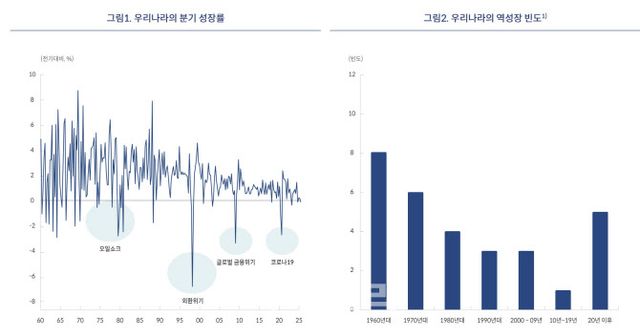 주요 선진국과 신흥국을 비교하면 평균 성장률이 낮을수록 역성장 빈도가 높아지는 경향이 뚜렷했다. 미국 등 분기 성장률이 0.5~0.6%(연율 2% 내외) 이상인 국가는 역성장 빈도가 안정적이지만, 일본처럼 분기 성장률이 0.2~0.3%(연율 1% 내외)로 낮아진 국가는 역성장 빈도가 크게 높았다.