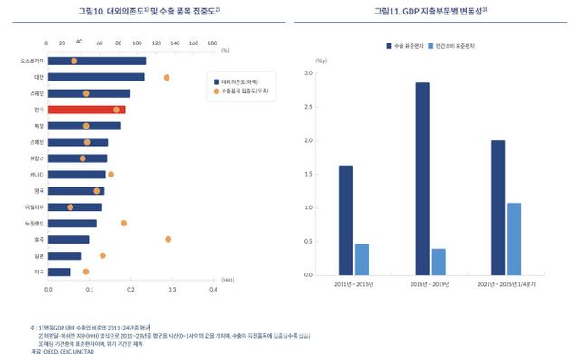 높은 대외의존도(명목 GDP대비 수출입 비중)와 일부 산업에 편중된 수출 구조도 성장의 변동성을 높이는 요인으로 꼽혔다. 우리나라의 대외 의존도는 2015년 75%에서 2021년 이후 83%로 높아졌고, 수출품목 집중도는 0.148에서 0.184로 상승했다. 이로 인해 글로벌 통상환경 변화 등 외부 충격에 더욱 취약한 구조가 됐다는 지적이다.