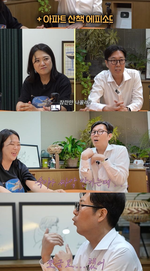이에 송은이는 "너 은근히 흘린다"며 김숙을 지적했고, 김숙은 "아파트가 조그마한 아파트라 산책길이 좁다. 기본적으로 붙어서 걷는다. 근데 작은 벌레가 너무 무서운거다. 그래서 갈 데가 없어서 이렇게 된다"며 김영철에게 안긴 상황을 재현했다.