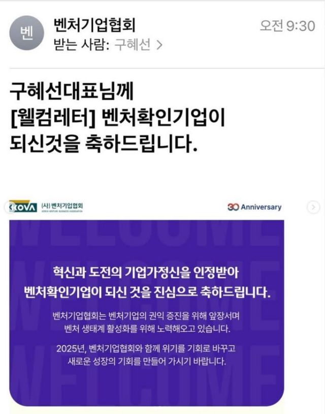 해당 게시글에서는 대표자 구혜선의 이름이 적힌 '예비벤처기업확인서'와 벤처기업협회에서 수신된 "구혜선 대표님께 [웰컴레터] 벤처확인기업이 되신 것을 축하드립니다"라는 내용의 문자메세지 등을 확인할 수 있다.