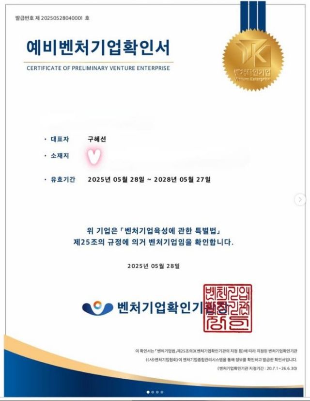 '예비벤처기업확인서'에는 "위 기업은 벤처기업육성에 관한 특별법 제25조의 규정에 의거 벤처기업임을 확인합니다"라는 문구가 적혀있으며 유효기간은 지난달 28일부터 2028년 5월 27일까지 3년 간으로 기재돼 있다.