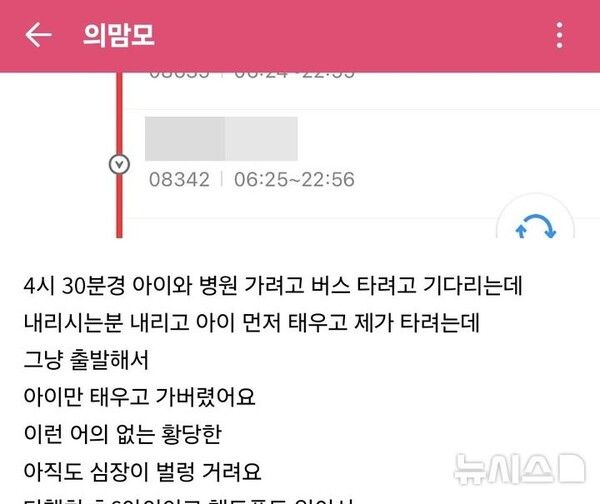 해당 글에는 "아이와 병원을 가려고 버스를 타는 과정에서 아이를 먼저 태우고 자신이 타려고 하는데 그냥 버스가 출발해 버렸다"며 "아이만 태우고 가버렸고 버스 문을 두드렸지만 무시하고 출발했다"고 설명했다.