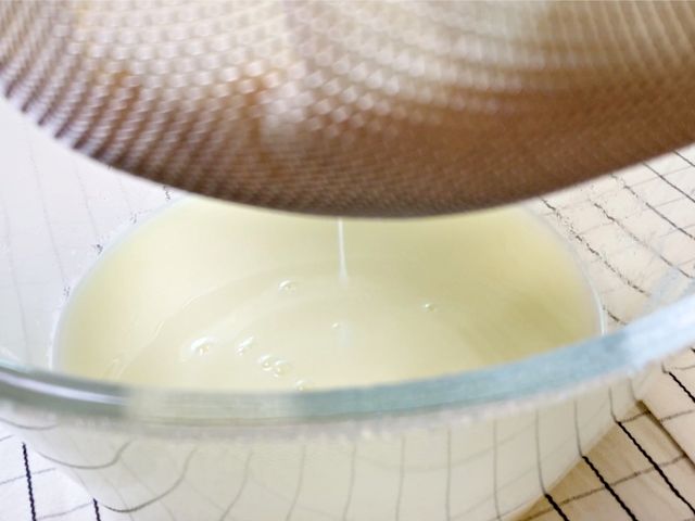 불을 끈 뒤 면보를 깐 체에 조심스럽게 부어주세요.