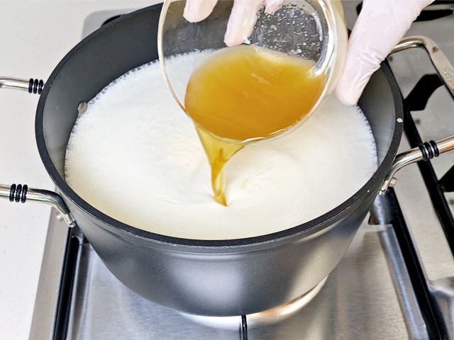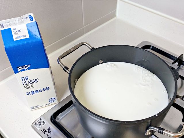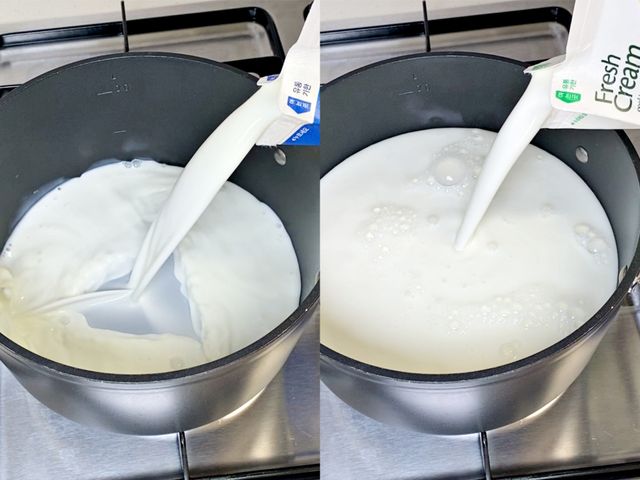 넉넉한 냄비에 우유와 생크림을 2:1 비율로 넣고
