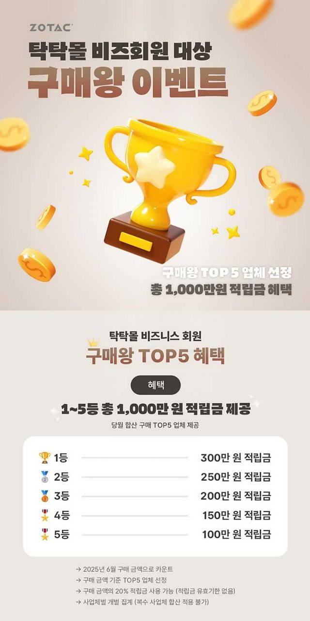 지포스 그래픽카드 전문 기업 조텍코리아가 자사 직영몰 탁탁몰의 비즈몰 회원을 대상으로 총 1,000만원 규모의 적립금 혜택을 제공하는 구매왕 이벤트를 진행한다.