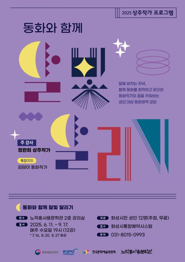 ‘동화와 함께 달빛 달리기’는 정란희 작가와 매주 수요일 저녁 함께 동화를 읽고 쓰면서 동화작가의 길을 찾는 창작 강좌이다. 운영 기간은 11일부터 9월 17일까지로, 총 12강으로 진행된다. 참여 대상은 동화작가를 꿈꾸는 만 18세 이상 화성 시민이다.