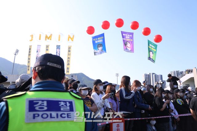 현장은 이른 아침부터 지민, 정국의 전역 직후 모습을 직접 보기 위해 국내외에서 모여든 팬들로 인산인해를 이뤘다. 취재진만 150여 명이 모인 가운데, 700명 넘는 팬들이 현장을 찾아 전역을 축하했다. 팬들이 준비한 애드벌룬이 파란 하늘을 수놓았고, 전역 축하 메시지를 담은 랩핑 버스와 취재진을 위해 마련한 커피차도 눈에 띄었다.