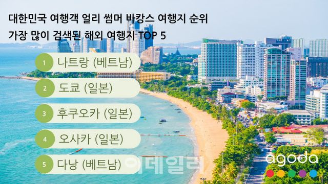 [이데일리 이민하 기자] 여행 플랫폼 아고다가 올해 6월과 7월 체크인 기준 숙소 검색 데이터를 바탕으로 대한민국 여행객 얼리 썸머 바캉스 여행지 순위를 발표했다. 1위는 베트남 나트랑이 차지했으며, 지난해 1위를 기록한 일본 도쿄는 올해 2위에 올랐다. 이어 일본 후쿠오카, 오사카, 베트남 다낭이 TOP 5를 구성했다.