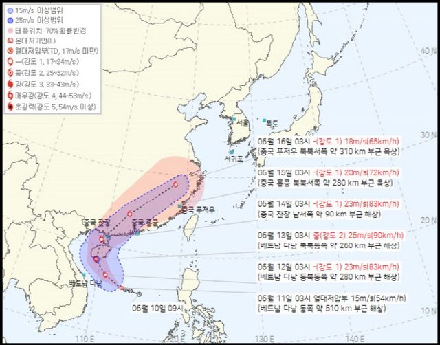 한국에서는 열대저압부 중심 최대 풍속이 초속 17m/s 이상이 되면 태풍으로 분류한다. 기상청은 10일 3시 30분 기준 이번 열대저압부가 태풍으로 발달한 뒤 중국 광둥성 남서부에 상륙해 14~15일께 중국 내륙에서 소멸할 것으로 예상했다. 이때 기상청이 예상한 최대 풍속은 13일께 초속 25m다.