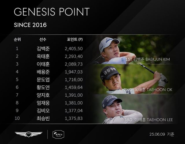 한편 시즌 종료 후 제네시스 포인트 1위로 ‘제네시스 대상’을 차지한 선수에게는 제네시스 차량, KPGA 투어 시드 5년과 PGA투어 큐스쿨 최종전 직행 자격, DP월드투어 시드 1년이 주어진다.