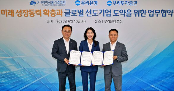 이번 협약식은 배연수 우리은행 기업그룹장, 남기천 우리투자증권 대표, 박미경 하이서울기업협회장 등 3개 기관 주요 관계자들이 참석한 가운데 우리은행 본점에서 진행됐다.