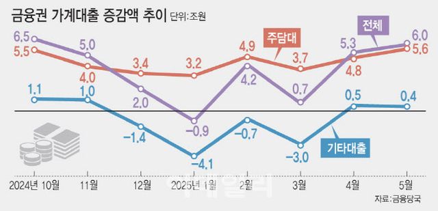 금융위원회와 금융감독원은 11일 ‘가계대출 동향’을 발표하고 지난달 금융권 가계대출이 전달보다 6조원 늘었다고 밝혔다. 이는 작년 10월(6조 5000억원) 이후 최대 증가 폭이다. 전체 금융권 가계대출은 올해 2월 4조2000억원, 3월 7000억원, 4월 5조3000억원에 이어 넉 달 연속 증가세다.