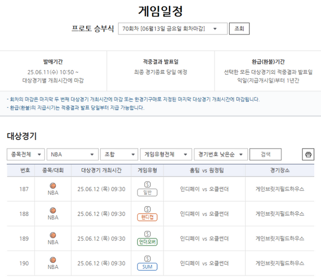 한편, NBA 플레이오프 파이널 3차전 인디애나(홈)-오클라호마(원정)전을 대상으로 하는 프로토 승부식 70회차의 상세 분석 및 구매 정보는 공식 인터넷 발매사이트 내 토토가이드 페이지에서 확인 가능하다.