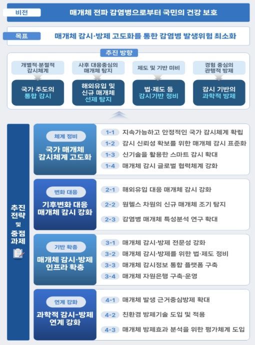 이번 중장기계획에서는 기후변화와 국제교류 확대에 따라 증가하는 모기·진드기 등 감염병 매개체의 위협에 능동적으로 대응하고, 지속가능한 감시·방제 체계를 구축하기 위한 종합적인 전략을 제시했다. 매개체 전파 감염병으로부터 국민건강을 보호한다는 비전하에, 매개체 감시·방제 고도화를 통해 감염병 발생위험을 최소화하는 데 중점을 두었다.