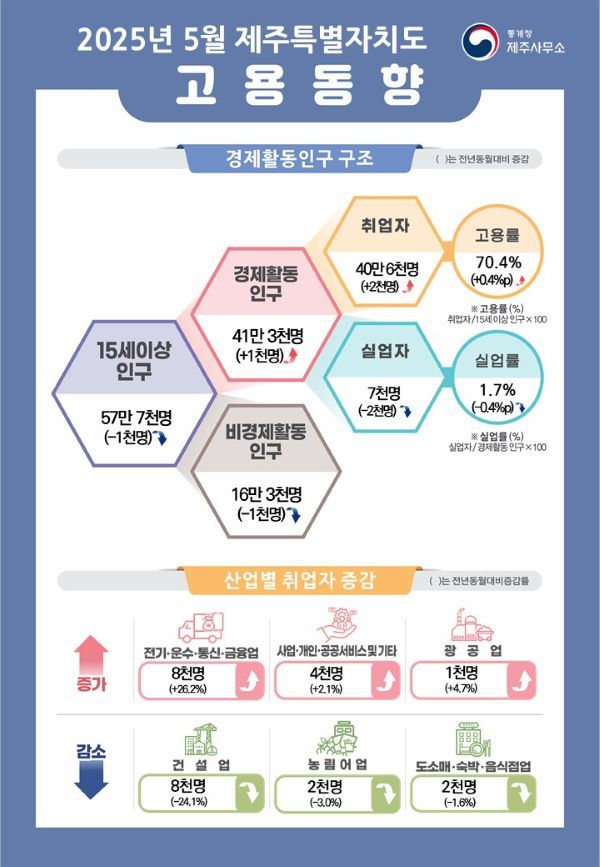 [한라일보] 5월 제주지역 취업자 수가 다시 40만 명을 넘겼다. 고용률은 70%를 상회했고, 실업률은 1%대로 떨어지며 전국 최저 수준을 기록했다.