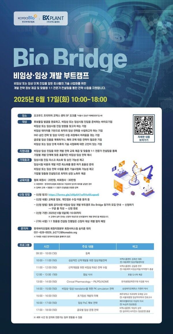 한국바이오협회는 비엑스플랜트와 오는 17일 바이오 기업의 성공적인 기술 사업화와 임상시험 전략 수립을 지원하는 '비임상·임상 개발 부트캠프 Bio Bridge'를 개최한다고 11일 밝혔다.