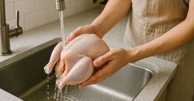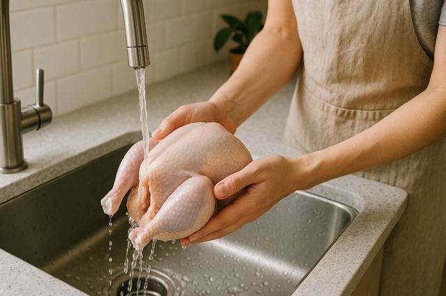 닭을 손질할 땐 먼저 흐르는 물로 외부 표면을 헹군다. 여기서 중요한 건 강한 수압을 피해야 한다는 점이다. 세게 틀어놓은 수돗물은 닭껍질에 붙은 세균이 물방울을 타고 주방 주변으로 튈 수 있다. 특히 캠필로박터 같은 세균은 날생닭에 흔히 존재하는데, 이 균은 열에 약하지만 생닭 손질 중 주방 기구나 싱크대 주변으로 옮겨지면 2차 오염을 유발할 수 있다. 따라서 흐르는 물로 조심스럽게 표면만 헹구는 것이 중요하다.