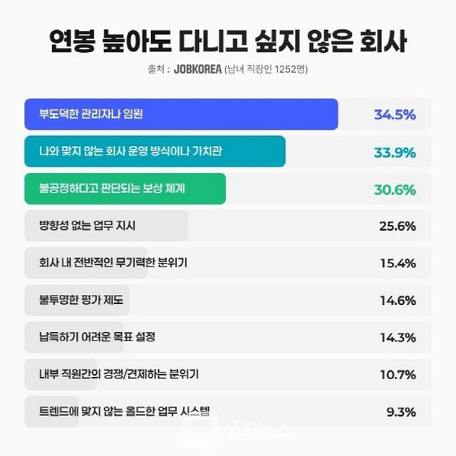 조사 결과, 응답자의 34.5%가 ‘부도덕한 관리자나 임원이 있는 회사’는 입사나 이직을 고려하지 않겠다고 응답해 가장 높은 비율을 기록했다. 특히 20대(36.4%)와 30대(34.5%)는 40대 이상(30.8%)보다 이 점을 더 중요하게 여기는 것으로 나타났다. 이는 MZ세대가 높은 연봉보다 조직 내 윤리와 공정을 더 중요한 가치로 인식하고 있음을 보여준다.