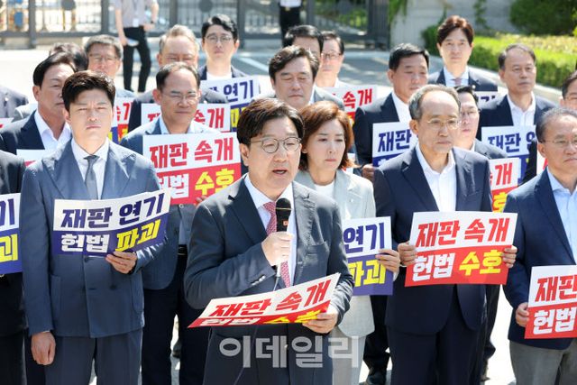 국민의힘은 이날 서울고등법원 앞에서 현장 의원총회를 열고 규탄 시위를 벌였다. 이 자리에서 국민의힘 의원들은 “재판을 중단하면 정의가 중단된다”, “당장 재판을 속개하라” 등의 구호를 외쳤다.