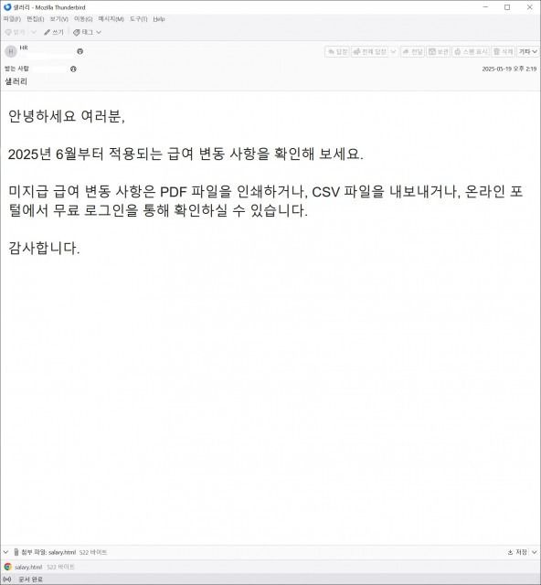 첫 번째 사례 속 공격자는 기업 인사 부서를 사칭해 ‘2025년 6월부터 적용되는 급여 변동 사항을 확인’하라는 내용의 피싱 메일을 유포했다. 메일 본문에는 ‘급여 변동 사항을 PDF 파일, 온라인 포털 등에서 확인할 수 있다’는 문구와 함께 .html 파일을 첨부해 사용자의 클릭을 유도했다.
