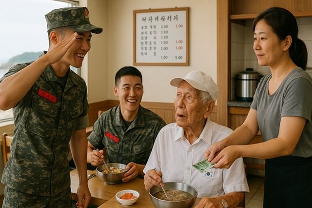 오 씨는 현충일 추념 행사에 참석한 뒤 동료 국가유공자들과 냉면과 수육을 먹고 있었다. 권 병장과 이 일병은 조용히 10만 원가량의 식사비용을 대신 지불해 그들의 고마운 헌신에 작지만 진심 어린 감사를 표현했다.