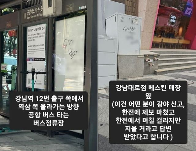 '지금 서울 전역으로 테러 당하고 있는 보아' 등의 게시물에는 서울 강남역, 신논현역, 역삼대로 등의 버스정류장 광고판이나 전광판 기둥에 써 있는 보아를 향한 악플이 낙서로 이어져 있습니다.