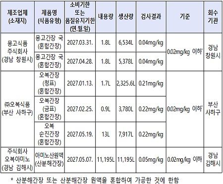 회수 대상은 아래 혼합간장, 산분해간장 6개 제품이다.