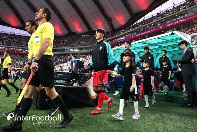 [인터풋볼=신동훈 기자(상암)] 황인범이 교체 출전한 손흥민에게 주장 완장을 건네는 장면은 팬들의 환호성을 자아냈다.